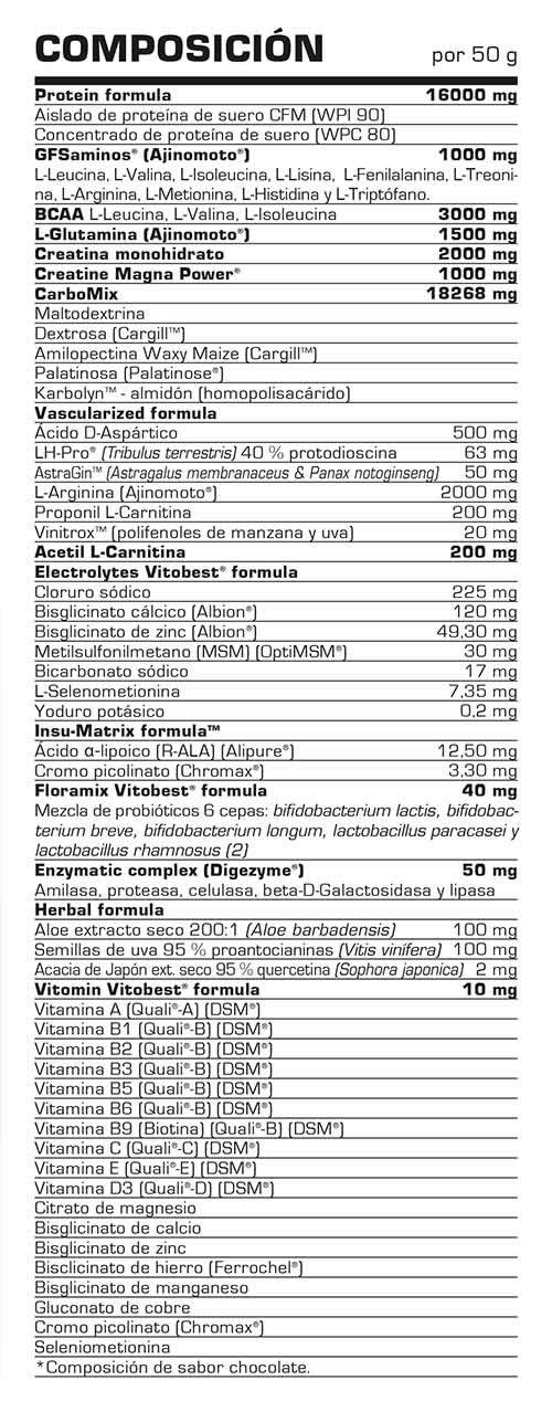 Sabor Chocolate: CarboMix [maltodextrina, dextrosa, amilopectina de maíz (sulfitos), palatinosa, Karbolyn™], concentrado de proteína de suero (leche y soja), aislado de proteína de suero instantáneo WPI 90 (leche y soja), cacao en polvo, creatina monohidrato, L-Arginina, L-Glutamina, L-Leucina, Creatina Magna Power®, GFSaminos®, L-Valina, L-Isoleucina, ácido D-Aspártico, aroma: chocolate, cloruro sódico, propionil L-Carnitina, acetil L-Carnitina, aroma: chocolate-galleta, bisglicinato cálcico, aroma: brownie, aloe extracto seco (Aloe barbadensis), semillas de uva (Vitis vinifera), edulcorante: sucralosa, LH-Pro® (Tribulus terrestris), DigeZyme® (complejo multienzimático), AstraGin™ (Astragalus membranaceus & Panax notoginseng), zinc bisglicinato, FloraMix® (probiótico), Metil-Sulfonil-Metano (MSM), Vinitrox® (extracto de uva y manzana) (sulfitos), bicarbonato sódico, ácido alfa-lipoico (R-ALA), Vitomin®, selenometionina, picolinato de cromo (Chromax®), acacia de Japón extracto seco (Sophora japonica) y yoduro potásico.