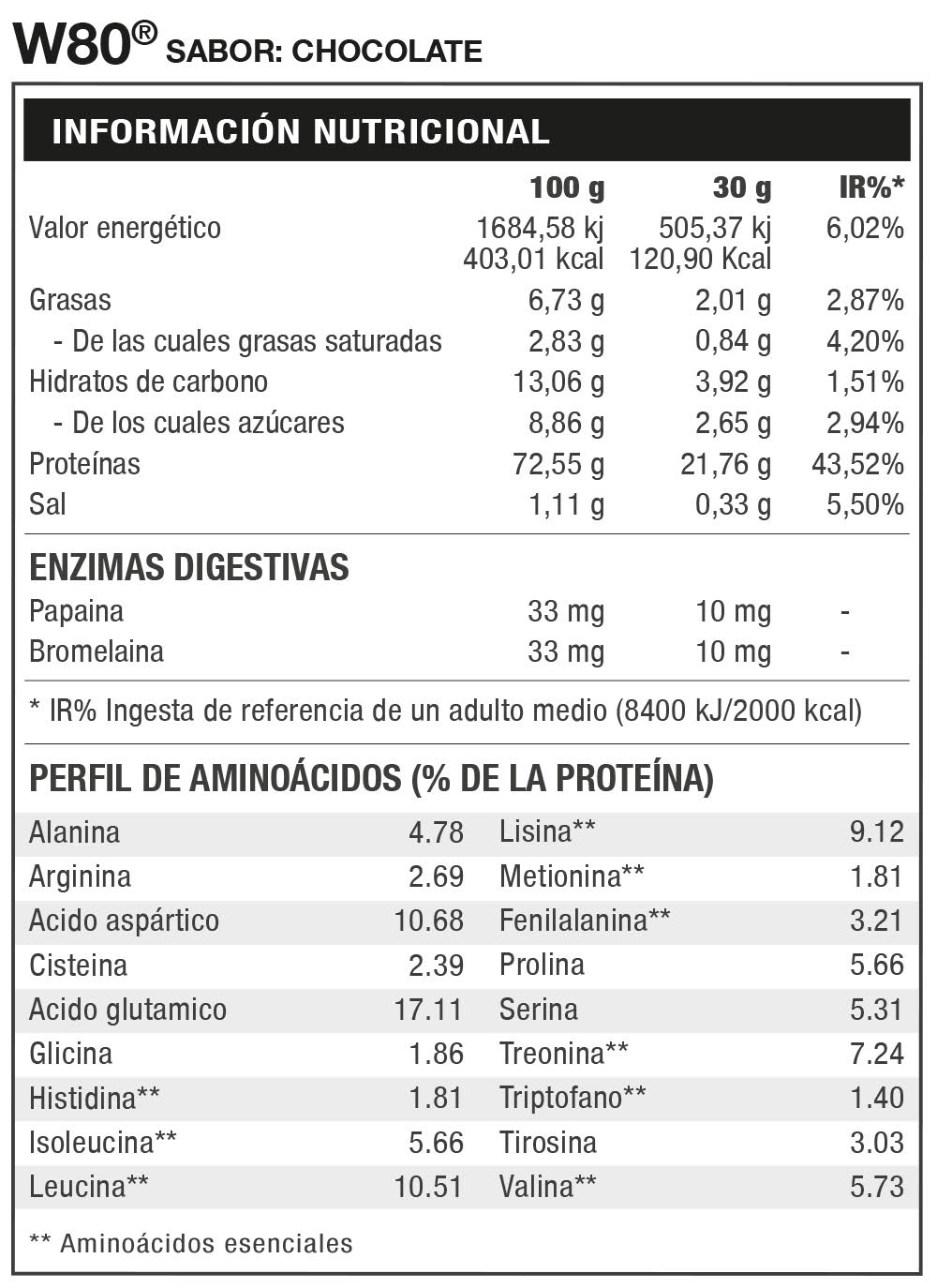 W80 de HERO TECH NUTRITION es un producto alimenticio en polvo con un alto contenido en proteínas a base de 100% concentrado de proteína de suero de leche WPC80. *Las proteínas contribuyen a que aumente la masa muscular. *Las proteínas contribuyen al mantenimiento de los huesos en condiciones normales. Las proteínas de suero son proteínas muy completas porque contienen los 9 aminoácidos esenciales (histidina, isoleucina, leucina, lisina, metionina, fenilalanina, treonina, triptófano, valina) que el cuerpo no puede sintetizar por sí mismo y es necesario obtenerlos de fuentes alimentarias.