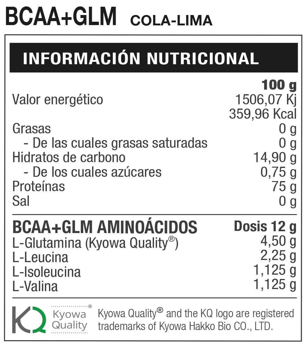Cola-Lima: L-Glutamina (Kyowa Quality®), L-leucina, L-isoleucina, L-valina, emulgente (lecitina de soja), aromas (cola, lima-limón), acidulante (ácido cítrico), colorante (caramelo de sulfito amónico), edulcorante (sucralosa). ALÉRGENOS: Contiene soja. Puede contener trazas de gluten, leche, huevo y pescado.