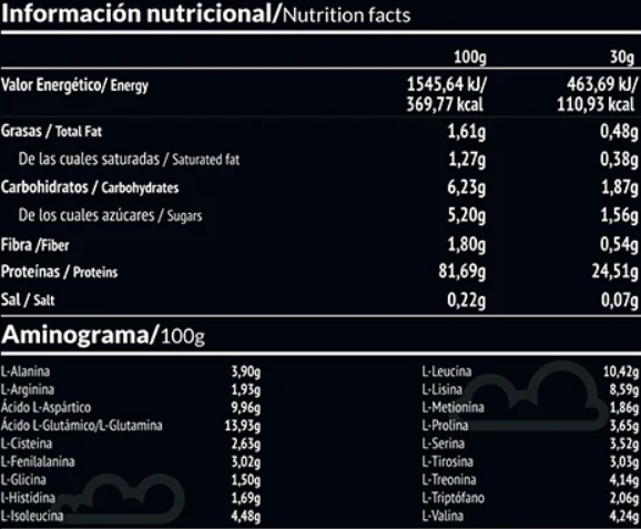 Aislado de proteína nativa de leche de vacas gallegas criadas en granjas extensivas, sabor neutro. Solo ingredientes naturales: Aislado de proteína nativa de leche (90% proteína) y cúrcuma. Alérgenos: Leche. Sin gluten. Sin edulcorantes.