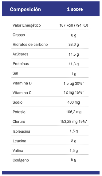 Maltodextrina. Dextrosa. Péptidos de colágeno. Fructosa. L-leucina. Concentrado de proteína de guisante. L-isoleucina. L-valina. Citrato de sodio. Acidulante: ácido cítrico. Aroma. Antiaglomerante : óxido de silicio. Cloruro potásico. Cloruro sódico. Edulcorantes: sacarina y sucralosa. Carbonato de magnesio. Fosfato de calcio. Ácido ascórbico. Colorante: E-120. Colecalciferol.