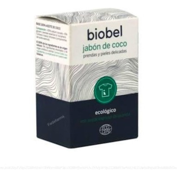 Jabón de coco biobel 100% aceite de coco puro y con aceite esencial de lavanda Pastilla de jabón de uso corporal (manos, cara y cuerpo), para limpiarlas y sanearlas; y uso textil, para lavar a mano las prendas mas delicadas Producto de limpieza certificado como ecológico por el sello EcoCert.