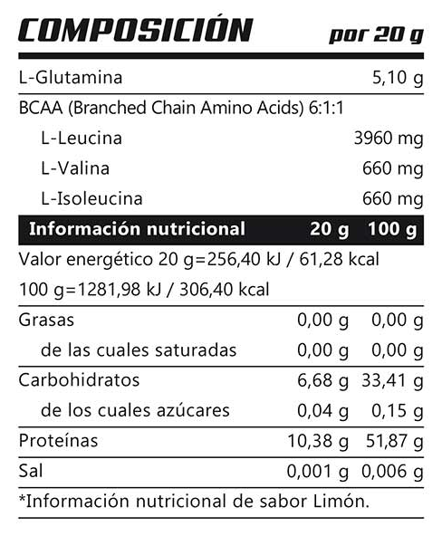 L-Glutamina, L-Leucina, L-Valina, L-Isoleucina, ácido cítrico monohidrato, zumo de limón en polvo, aroma: limón, edulcorantes: eritritol y sucralosa y colorante: E-102.
